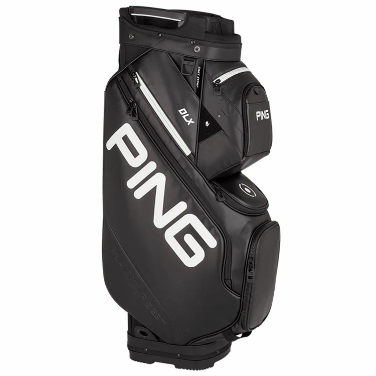 | Ping DLX Golf Cart Bag Ultimate Performer In A Premium Construction The Ping DLX bag offers premium look and performance. From it’s specially engineered 15-way Air Mesh top with large dividers, to its 14 pockets, and its newest feature: two deployable shoe pouches. Pockets range in size for storing range finders, beverages, apparel, tools, and more. A cart-strap channel keeps pockets accessible when the bag is strapped to a cart, and a heavy-duty polyurethane material provides long-lasting quality. The rubberized, cross-design bottom fits securely on motorized and pull carts. A premium golf bag, the DLX is a market leader for the true trolley player. |