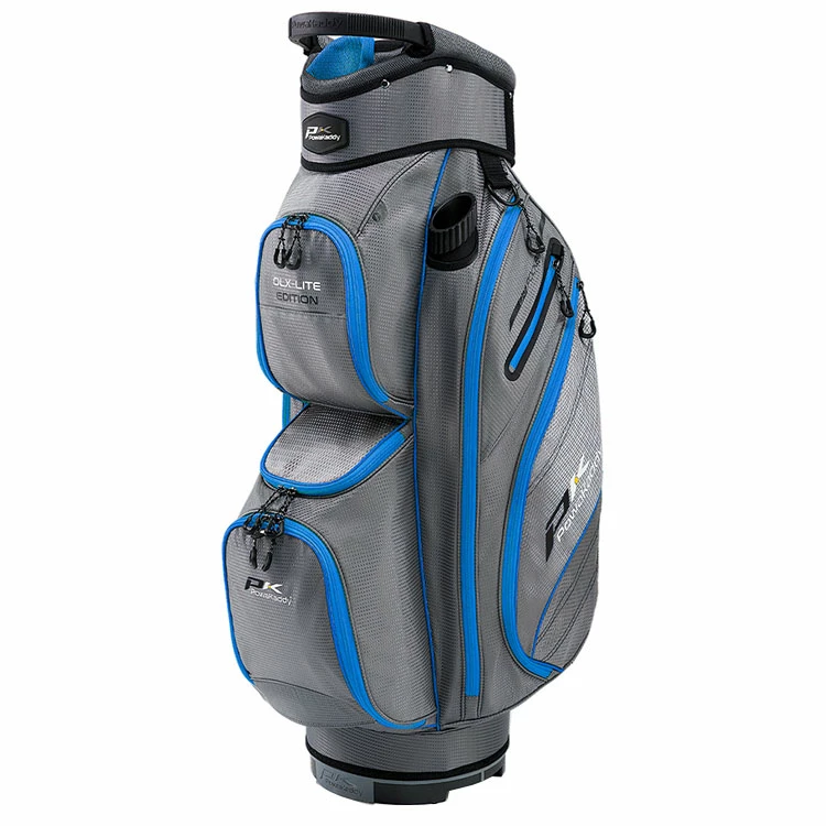 | PowaKaddy DLX-Lite Edition Golf Cart Bag Modern Features With Exceptional Storage The new PowaKaddy DLX-Lite cart bag has been designed with a modern sleek design incorporating a new 14-way divider with designated divider for putters with larger size grips. It is an extremely well-designed mid-priced bag offering exceptional value with its 11 storage pockets as well as the PowaKaddy key lock Key-Lock anti twist system to stop your bag from twisting on the trolley. The durable nylon construction makes it a lighter option and has plenty of space for all your golfing gear as well as a pocket to protect your valuables. |