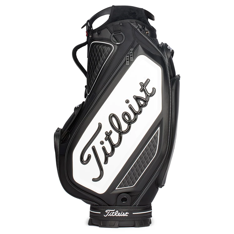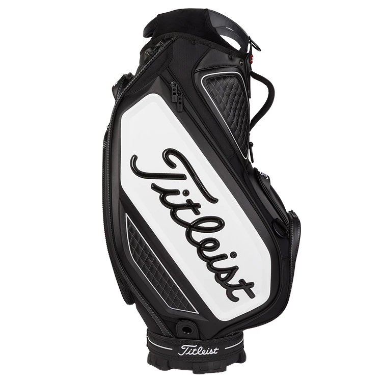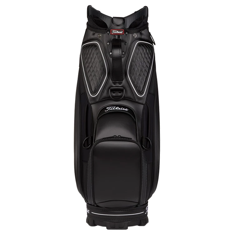 | Titleist Golf Tour Staff Bag Tour Proven Design With Luxurious Detailing The most used staff bag on tour, the new Titleist Tour Staff Bag has a contemporary design with refined details and modern styling. With a new lighter weight construction, this Tour Staff Bag features a 9.5″ 6-way velour divider top with integrated lift handles for easy transportation. Complete with a total of 6 pockets including a large apparel pockets, magnetic pockets, valuables pocket and much more. With luxurious quilted panels, a matching rain hood and adjustable strap system, the Titleist Tour Staff bag is a best seller for the serious golfer. |
